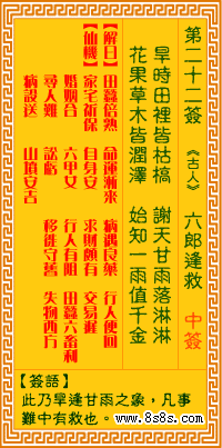 詩意:此卦旱逢甘雨之象 凡事難中有救也