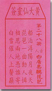 這又是一支與唐朝詩人白居易有關的簽,不過,這是中平,而第廿四簽是下下。區別是,廿四簽失於孤單;這支則屬中平,因為,總算有片刻的歡娛。白居易在潯陽江頭夜送客,在船上聽到悅耳的琵琶聲,尋聲訪問,得見一失意女子,「同是天涯淪落人,相逢何必曾相識」,白居易有感於自己的落泊與琵琶女的遭遇,寫成了著名的長詩《琵琶行》。這簽中雖有快活,但極短暫,宜修身,忍守。
