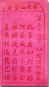 這支籤,是平貴在軍中建立戰功,得意回窯,與妻子寶釧重逢的好景--眼前的事,就好像船靠岸,還愁沒有風景?抬頭見到前面的村屋,在夕陽裡升起陣陣的炊煙。