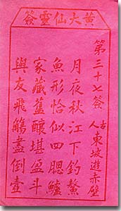 這支籤,記述蘇東坡游赤壁的賞心樂事:秋月照在江水,與好朋友泛舟垂釣,居然釣到極品「四腮臚」,於是,把家藏的舊酒拿出來,與大家分享,共度這段歡樂時光。