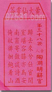 晉朝,陶淵明不為五斗米而折腰,辭官不幹,返鄉下享其清福。過著歸隱的生活,他為此而寫的《歸去來辭》,就是這支籤的含義。