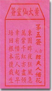 此簽是提出一個警告:今年會有較大的波折,「天時」稍差,「地利」亦易有失,唯一可取的,就是「人和」,希望有貴人相助,度過難關,回復生機。東園的百花,被狂風所吹襲,幸有惜花之人,不辭勞苦,去善後,去化險為夷,這個惜花人,可以是自己,也可以是別人。