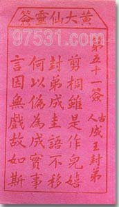 成王,西周國王,年幼喪父,國事暫由王叔周公管理。成王有一天,與弟弟唐叔玩遊戲,成王把桐葉剪成圭形,說:「我封你為諸侯。」周公知道這件事,便恭喜唐叔。成王卻說,開玩笑而已。周公教訓他:「君無戲言。」後來,周公東征勝利,鞏固了西周的政治勢力,並還政於成王,成王大封諸侯,果然守信,把唐這地方封給唐叔。此簽之含意甚深,凡事要誠懇,慎言,守信,兄弟要和好。