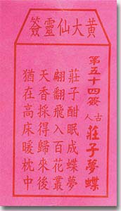 這支籤,說的是「莊周夢蝶」的故事:話說莊子在夢中化成一隻蝴蝶,在百花叢裡飛來飛去,採得香花歸來時,卻發現自己仍然睡在高床暖枕裡。