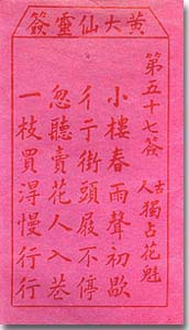 您看看簽語怎麼說?--在小樓上,聽得綿綿的春雨終於停下來了,但街頭的腳步聲,卻又響個不停,忽然聽見巷口傳來賣花人的聲音,馬上買了第一枝花,然後在濕滑的街上,安步走回家。