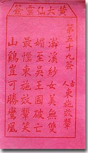 這支籤是說,西施這位浣紗女,美艷無雙,一笑傾城,再笑便令吳王傾國了。最不自量的是醜女東施,整天模仿西施皺眉頭的樣子,以為可以博取別人的憐愛,其實,山雞就是野雞了,豈可以冒充鳳凰呢?