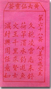 姜太公,懷才不遇,只有在山水間寄托自己的凌雲大志。他在渭水釣魚,荷枝作著名的古語--「姜太公釣魚,願者上鉤」。當時,紂王無道,群雄並舉,周文王不遠千里而來,到渭水之濱尋訪隱居的姜太公,終於,姜太公協助周文王、周武王,打敗了紂王,建立周朝帝業。此簽雖為中吉,但寓意吉祥,求得者,只要能順應天時,立心良善,必然萬事如意。