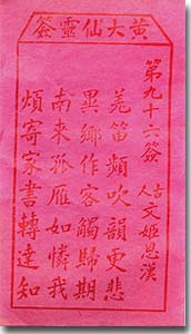 蔡文姬,東漢人,為匈奴亂兵所掠,嫁與左賢王,十二年後才歸漢家。這是一個悲涼的意境,在秋冬兩季求得此簽者,要特別小心。如果在春夏時分求得,則及早趨吉避凶。羌笛在塞外頻吹,曲調更令人傷感。它使異鄉的遊子,醒悟起歸家的日子,遙遙無期。南來的孤雁,假若同情我,請常常替我傳遞家書給故鄉的親人。