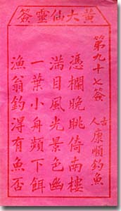 這支籤中雖然並無凶險,但亦只空有良辰美景,釣魚不得其法,有無收穫,還是個未知數。倚著向南樓台的欄杆,滿目的風光景色幽雅,水面上,有一葉小舟,只見康順作漁翁打扮,頻頻下釣,至於有沒有魚獲,那就不得而知了。