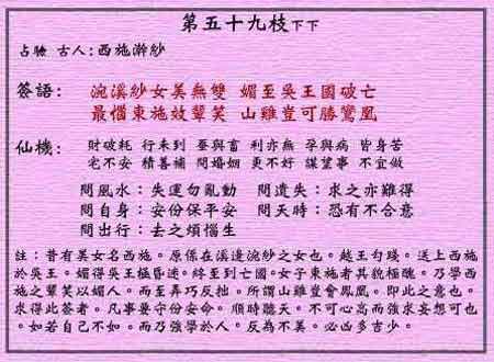 昔有美女名西施,原為在溪邊碗紗之女,越王勾踐,送上西施於吳王,媚得吳王極昏,終至亡國,有女子東施者,其貌極醜,乃學西施之顰笑以媚人,以至弄巧反拙,所謂山雞豈會變鳳凰,即此之意也,求得此簽者,凡事要守份安命,順時聽天,不可心高而強求妄想,明知自己不如人,而強學於人,反為不美,必凶多吉少