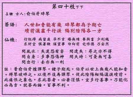 春秋時出了一位傑出的琴師名伯牙,他有一位知音,就是鍾子期,可惜鍾子期比伯牙先離開這世界,伯牙悲痛不已,把心愛的琴摔得粉碎,他哭著在墳前說:世上只有子期才領會我的琴意,子期死了,陰陽相隔,天各一方,彈琴還有甚麼意思呢!從此真的不再彈琴了。此簽為下下,既有悲痛之象,亦有失友失物之意,而且暗示本身的才華無人賞識。