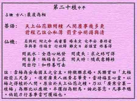 黃大仙靈簽第二十簽:雪梅招親 (中平靈簽)