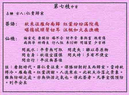 黃大仙靈簽第七簽:仁貴歸家 (中吉靈簽)