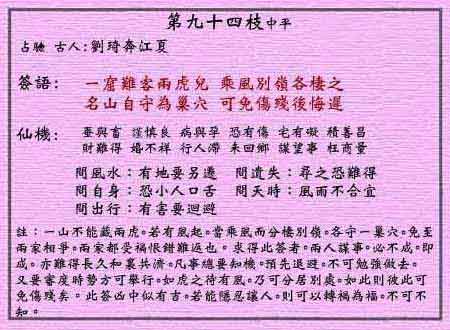 黃大仙靈簽第九十四簽解說及記載: