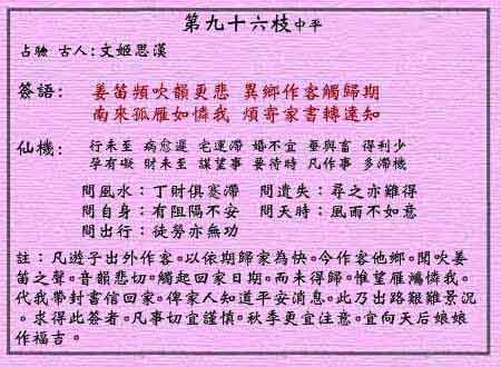 黃大仙靈簽第九十六簽:文姬思漢 (中平靈簽)