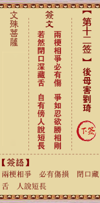 籤詩:兩梗相爭必有傷,爭如忍欲勝相剛,若然閉口深藏舌,自有傍人說短長。