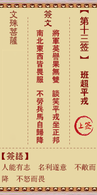 籤詩:將軍英譽果無雙,談笑平戎坐正邦,南北東西皆畏服,不勞兵馬自歸降。