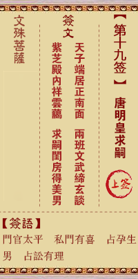 籤詩:天子端居正南面,兩班文武締玄談,紫芝殿內祥雲藹,求嗣閨房得美男。
