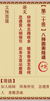 詩文解譯:紛紛南北路歧多→譬喻事情紛亂,令人不知怎麼辦。觴景昏迷怎奈何→遇到這種困境就茫然這怎麼行。忽遇貴人相指引→忽然遇到貴人的指引。此身方喜出塵羅→這時終於歡喜的脫離了苦惱和困頓。塵:塵埃,苦惱之意。羅:羅網,受困之意。