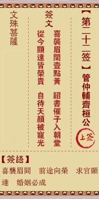 解曰:喜襲眉間 前途向榮 求官顯達 婚姻必成