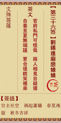 籤詩:官府私門可怪哉,兩人相見自疑猜,自春至夏無端謹,更合堤防笑裡來。