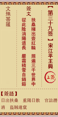 籤詩:扶桑擁出一紅輪,照遍三千世界中,從此陰消陽道長,嚴霜積雪自銷櫧。