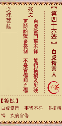 籤詩:白虎當門事不祥,能招橫禍及災殃,更防訟獄多憂制,不是官傷即血傷。