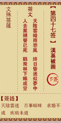 當前的位置:三藏算命網 - 算命大全 - 文殊菩薩靈簽 - 文殊菩薩靈簽解籤 第四十七簽