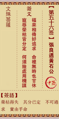 本簽重點:人生有多少福報,都是先天注定,要是沒這個福報,那貪多而求也是白忙一場。因此當隨緣認份,安守當前。若想未來更有福報,那當行善佈施。