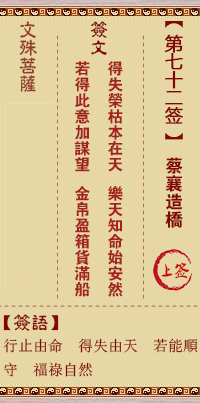 籤詩:得失榮枯本在天,樂天知命始安然,若得此意加謀望,金帛盈箱貨滿船。