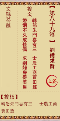 籤詩:轉怒朱門喜有三,士農工商賈田蠶,婚姻不久成佳偶,求嗣歸房得美男。