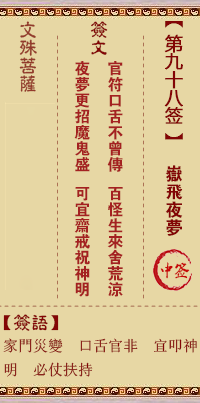 詩文解譯:官符口舌不曾傳→既沒有官司,也沒有口舌之爭。百怪生來捨荒涼→但卻怪事頻發生。夜夢更招魔鬼盛→睡覺中還有鬼怪的惡夢。可宜齋戒祝神明→可以持守界齋戒和求拜天神以得保佑。