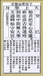 【台灣育德媽祖同修會】勸君把心安定下來,莫再虛慌。時運得安,前途清吉,可以說這期中並無什麼大事會發生,又神明守護著,大可安居樂業。這首籤詩告訴當事人須先定下心來,不要慌慌張張,才能從容把事做好。同時安慰當事人,運氣安泰,不必擔憂,大可安心做事。此簽問求財,小錢可獲得,但大錢不易成功。問功名,成績恐不理想,但在用功,下次很有希望。問婚姻,立定主意,可以談成。問作事,以誠實態度,可以達成目的,問訴訟,和解為宜。出外移居,均吉。曾有某人擔憂國際局勢變化,欲舉家移居國外,至媽祖廟抽得此簽,至畬處求解。畬曰:「籤詩明白告訴您,叫您定下心來。不看籤詩上明明兩個『安』字嗎?聖母叫,安,安,不必心慌。」其實,此地一切安好,乃是大家有目共睹。