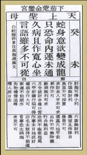 蛇身意欲變成龍以這樣的條件而要成就非凡之事,這是有困難的重要關鍵字句解說:代表當前想要成就之事,困難達成。因為本身條件或身份不太夠。只恐命內運未通只恐怕命運沒有這麼暢通久病且作寬心坐若條件不好,那就放輕鬆吧言語雖多不可從旁人的意見雖多,但是不要依從重要關鍵字句解說:因為依從反而情況更糟。