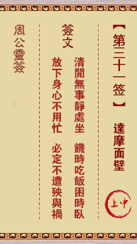 本簽曰。清閒無事靜處坐。饑時吃飯困時臥。可知君爾者當守己安靜之時。凡事宜守舊。不宜在此時輕舉妄動。動則凶。靜則吉之刻。放下身心不用忙。唯有如此。方可除去禍與殃。易言之。守己安靜即是待他時之至。必定周全。