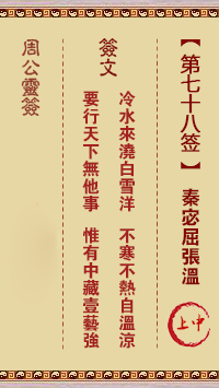 本簽即是平穩用事時。凡事大吉利者。亦即是冷水來澆時也。白雪洋。時令不寒不熱時自有溫涼者。逢此時令時。君爾行天下時。並無他事。唯君汝。必須藏有一藝之長久。可行天下無阻。易言之。囚徒得赦病遇良醫求財謀望貴人指迷。