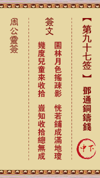 當前的位置:三藏算命網 - 算命大全 - 周公靈簽解籤大全 - 周公靈簽解籤 第九十七簽