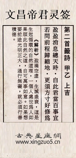 當前的位置:三藏算命網 - 算命大全 - 文昌廟靈簽 - 文昌帝君靈簽解籤 第二簽