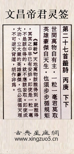 當前的位置:三藏算命網 - 算命大全 - 文昌廟靈簽 - 文昌帝君靈簽解籤 第二十七簽