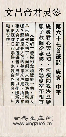 文昌帝君靈簽第六十七簽:庚庚中平