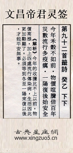 文昌帝君靈簽第九十二簽:癸乙下下