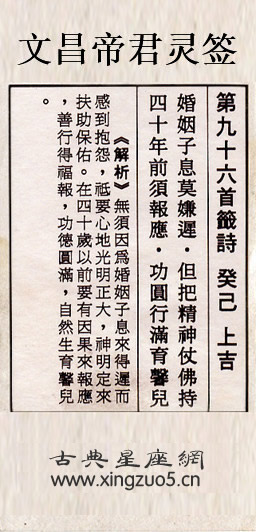 當前的位置:三藏算命網 - 算命大全 - 文昌廟靈簽 - 文昌帝君靈簽解籤 第九十六簽