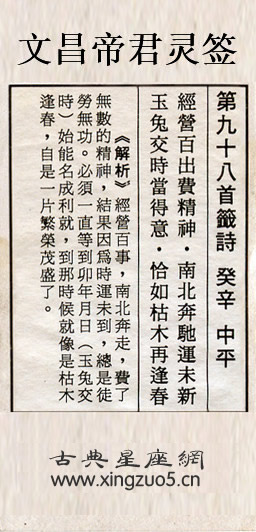 先凶後吉,凡事逢春則吉,遇到卯年月日,百事漸亨,方可營計。若貪求,徒勞心力,求名晚成,訟可解,婚宜審。行人有阻,謀望皆要平心和氣,方免是非。